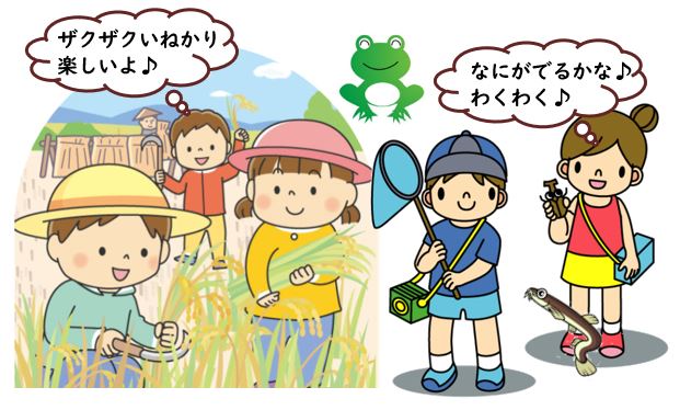 「稲刈り収穫体験」と「田んぼの生きもの調査」を行います。