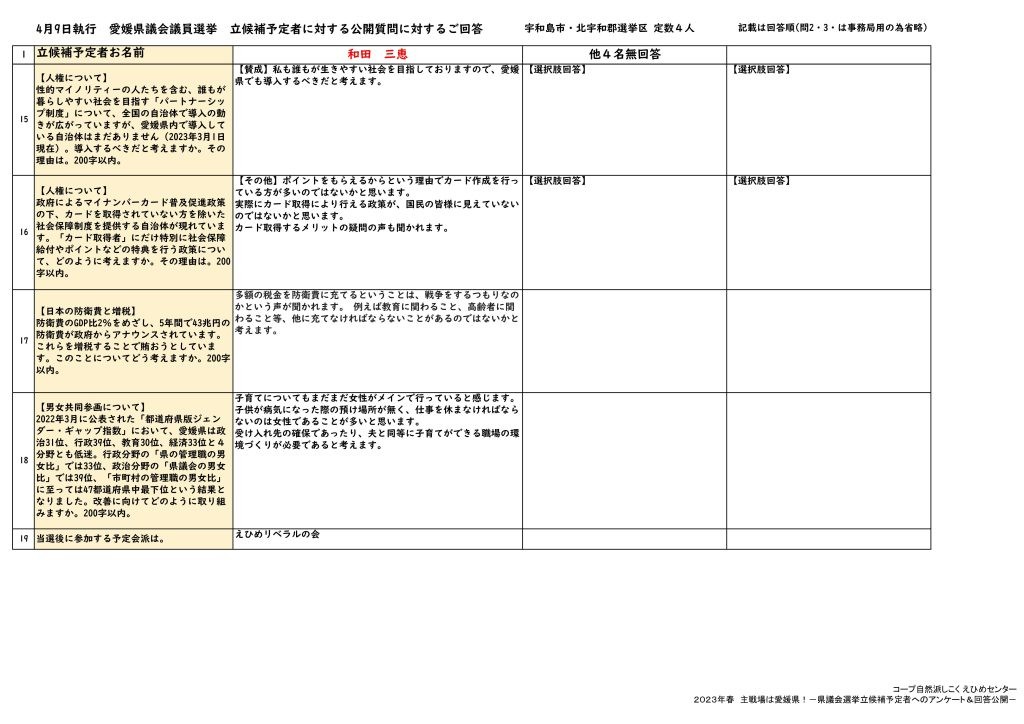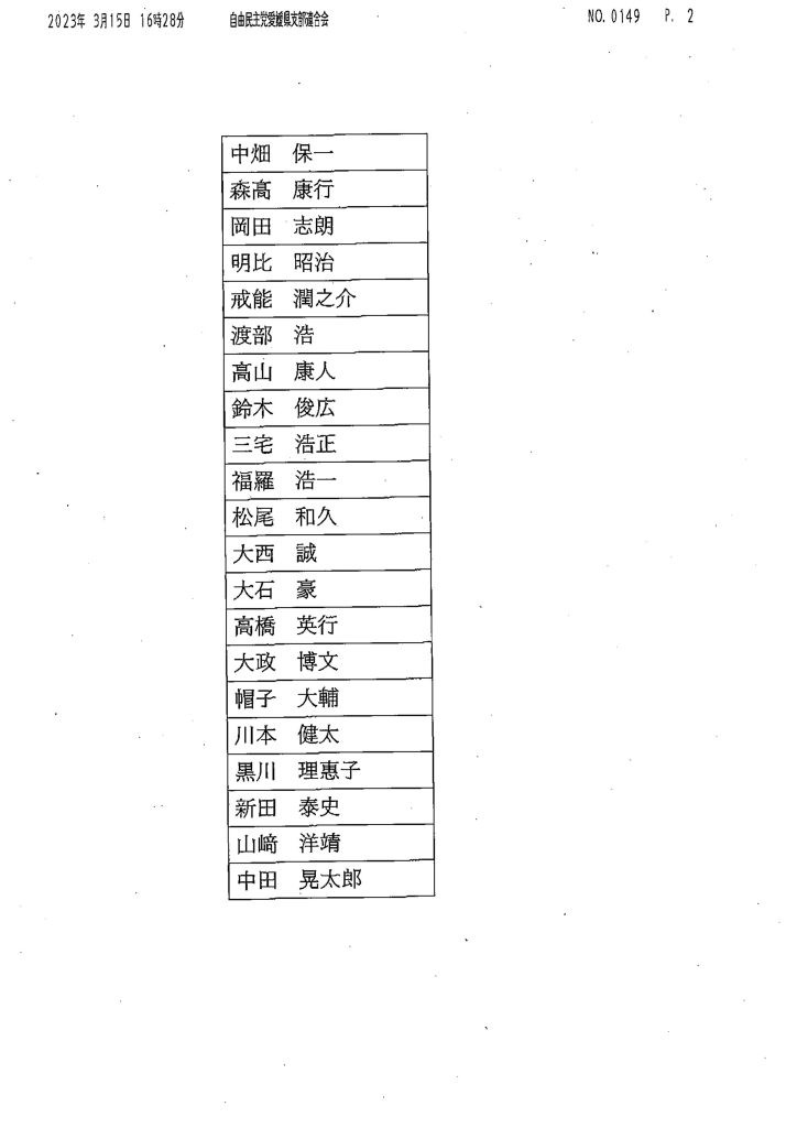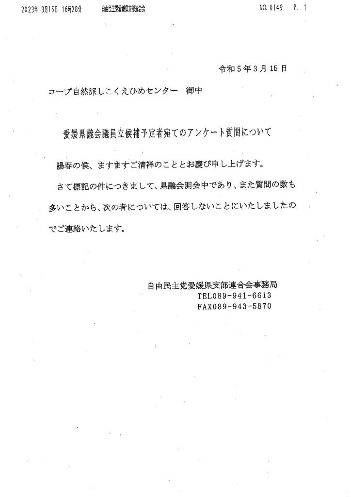 3月15日、自由民主党愛媛県支部連合会事務局から 質問には回答しない旨とその名簿21名分がFAXとして連絡がありました。