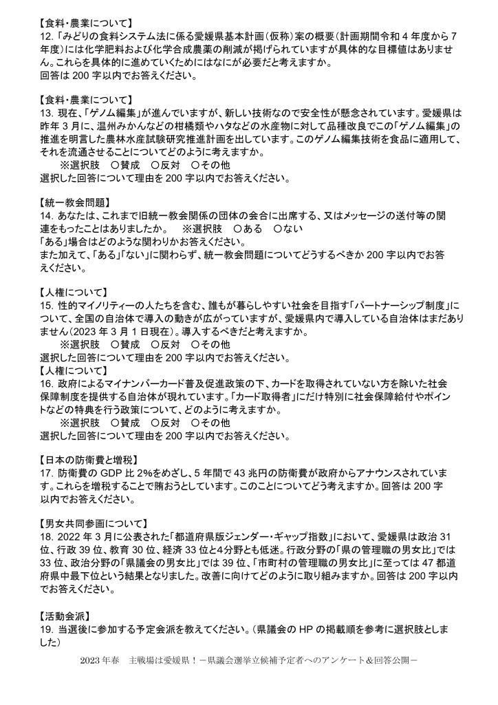 私たちは愛媛県民が県政および選挙に関心を持つようになり、投票率が向上することを目指し、今年の4月9日㈰に予定されている愛媛県県議会選挙投票日に向けて、愛媛新聞が3月1日に新聞紙上で掲載した立候補予定者を参考にし愛媛県下62名の立候補予定者にアンケートをお願いしました。
