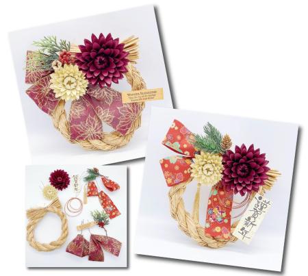 papier createさんのペーパーフラワーとオーガニックの稲わらリースを使って、クリスマスとお正月にご使用いただける、2WAYリースを作るワークショップです。