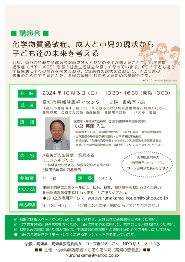 【こうち】化学物質過敏症、成人と小児の現状から子ども達の未来を考える 講演会