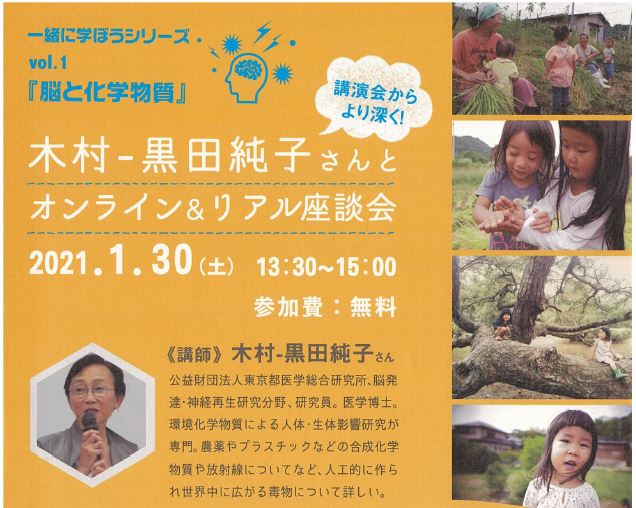 この化学物質が脳に与える影響に造詣の深い木村-黒田純子さんの講演会を事前に視聴し、1月30日は木村-黒田さんとオンラインでつなぎ双方向の座談会形式で学びを深めようとの企画です。まずは知ること、知って選び方を変えたりちょっと気を付ければ「脳」への影響が大きく変わるかも?!