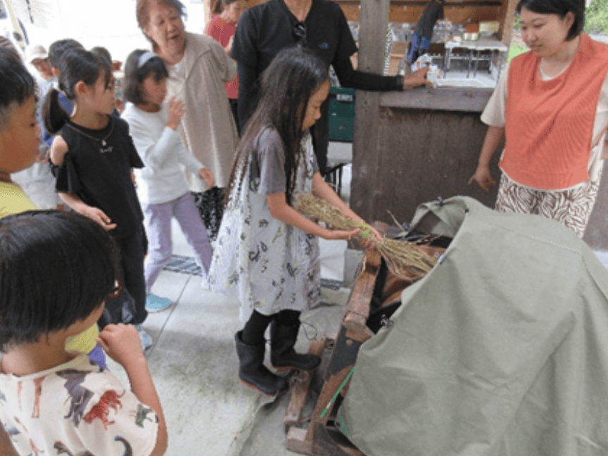 松ヶ丘集会所では、刈り取った稲を足踏み脱穀機や千歯扱ぎで脱穀し、すり鉢と野球ボールを使って“もみすり”をする作業を体験しました。