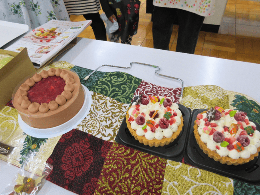 恒例のクリスマスケーキの食べ比べと食材セットの試食を行い、食材セットは野菜ハンバーグと豆乳チャウダー、お米は「ツルをよぶお米」を使用しました。
