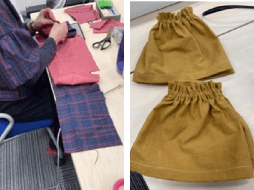 今回は、前回より取り組んでいた着物リメイクのブラウスが完成していて、その残り布で袋を作ったり、エリを使って何か作れないかということで、色々みんなで意見を出し合って、お揃いのストールを作ることになりました。